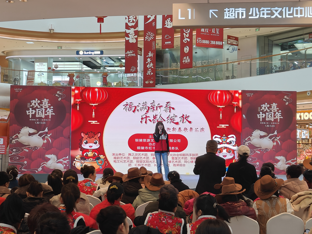 1月31日下午,铜陵吾悦广场热闹非凡,由市红十字会联合铜陵悠游文化传媒有限公司举办的“福满新春·乐龄绽放”迎新春歌舞汇演在此温情上演。