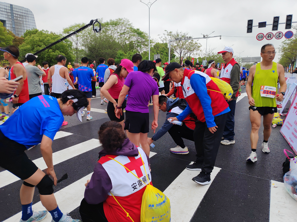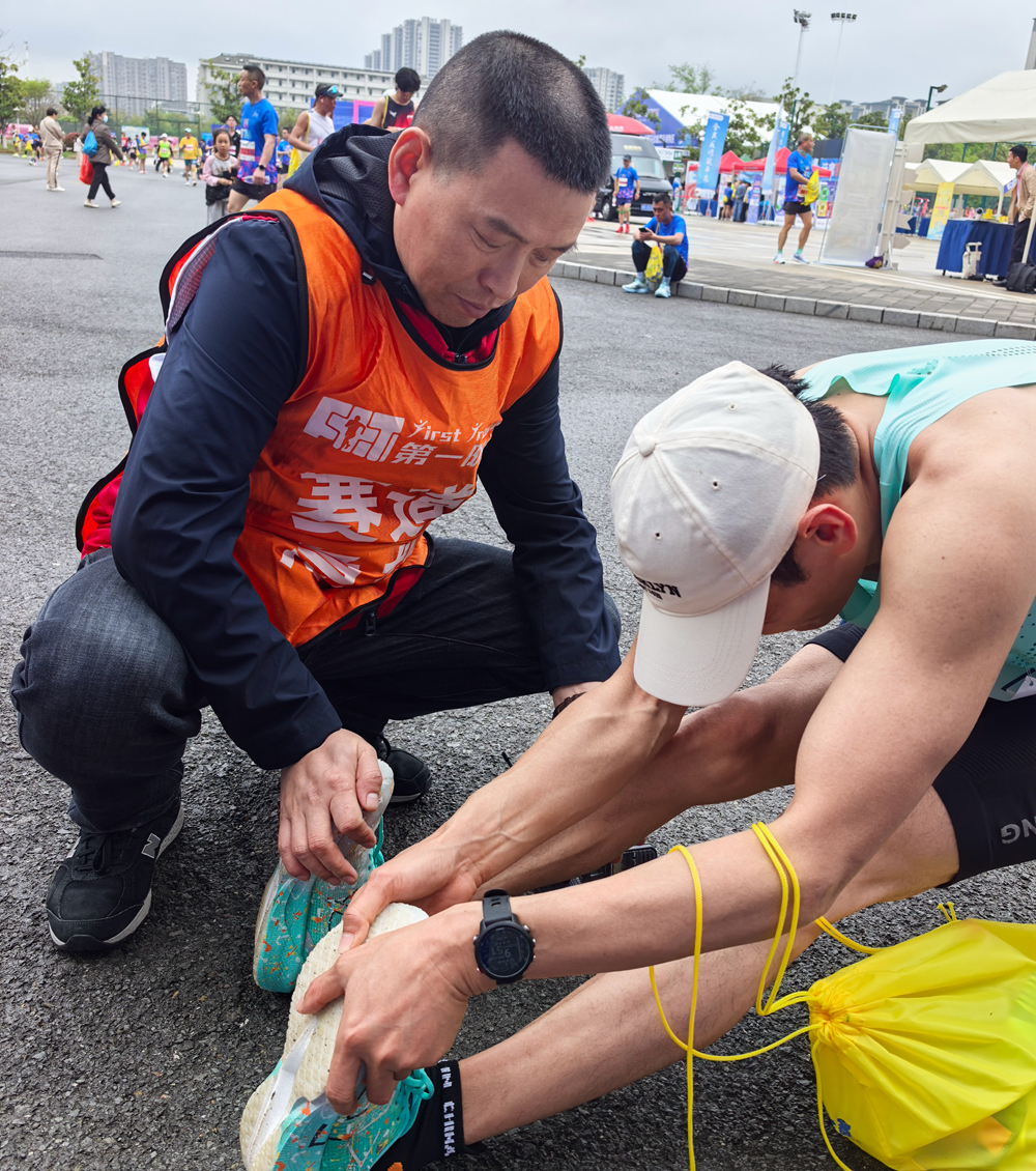 赛事当天,志愿者们凌晨便集结出发,携带急救包、AED等设备,准时进驻赛道各关键点位。从起点到终点,他们或定点值守、或流动巡查,密切关注选手状态,随时应对抽筋、扭伤、体力不支等突发情况。每当有跑者出现不适,志愿者们立即上前,提供喷雾舒缓、拉伸按摩、补水补给、临时包扎等及时救助,用娴熟技能与暖心服务,为跑者缓解不适、保驾护航。