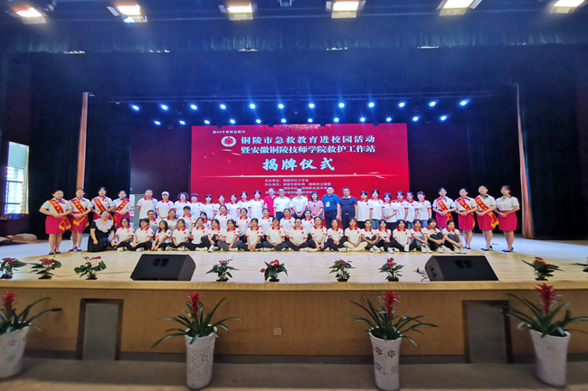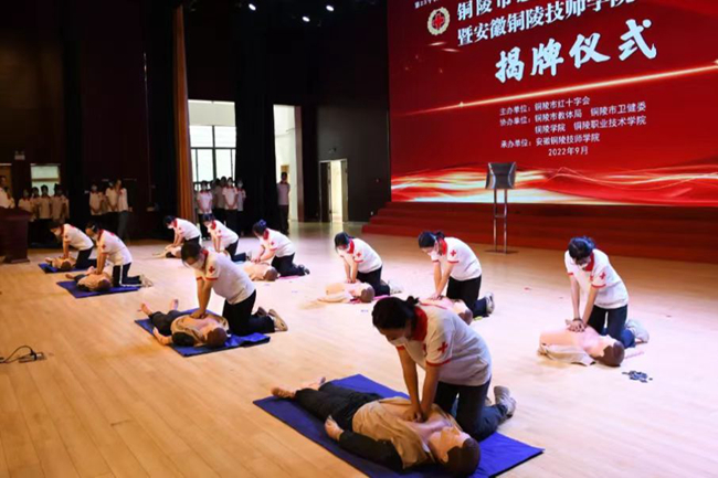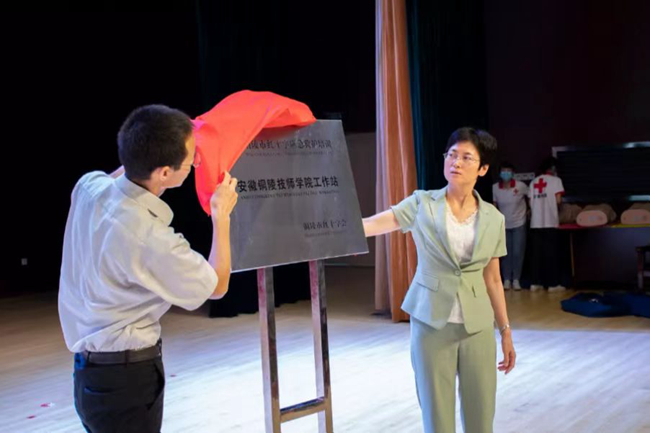 活动中市政府副市长杨文萍与技师学院党委书记管清华共同为救护工作站成立揭牌。此次成立的救护工作站是铜陵成立的首个高校红十字应急救护培训站,也标志在新时代发展背景下,红十字应急救护培训事业取得了新的进展。