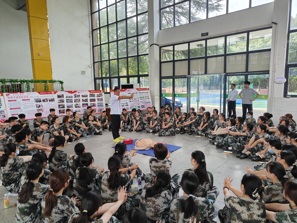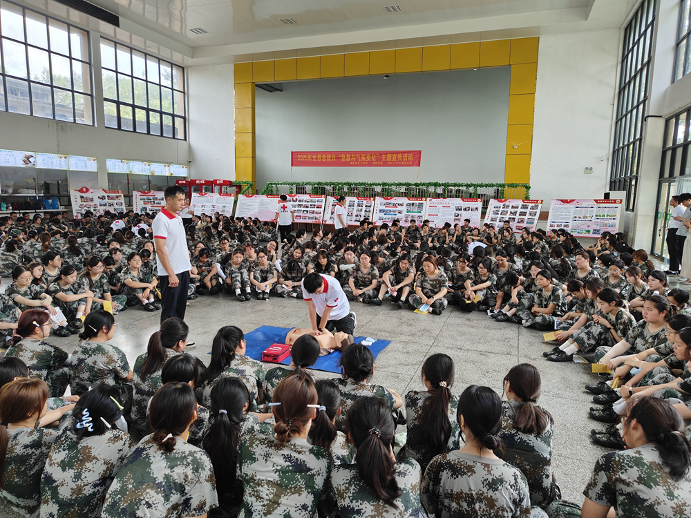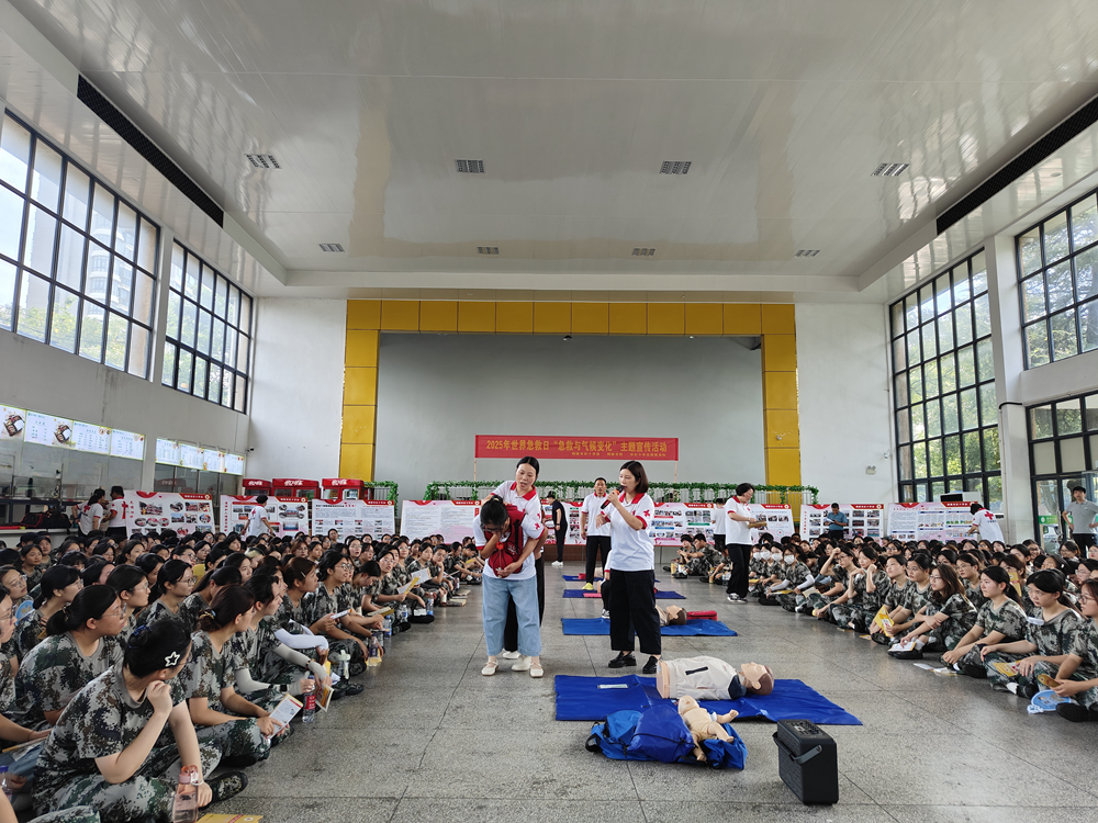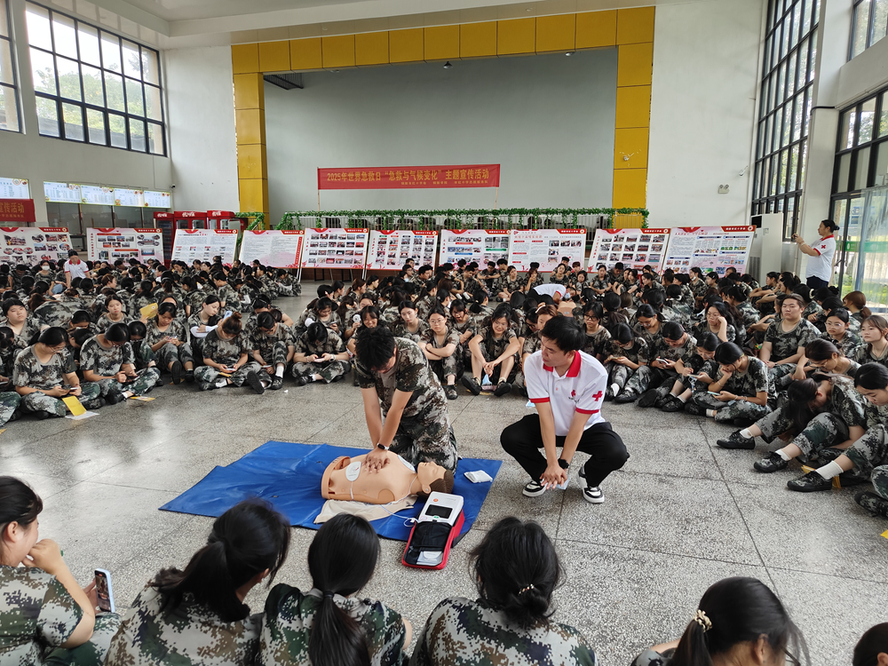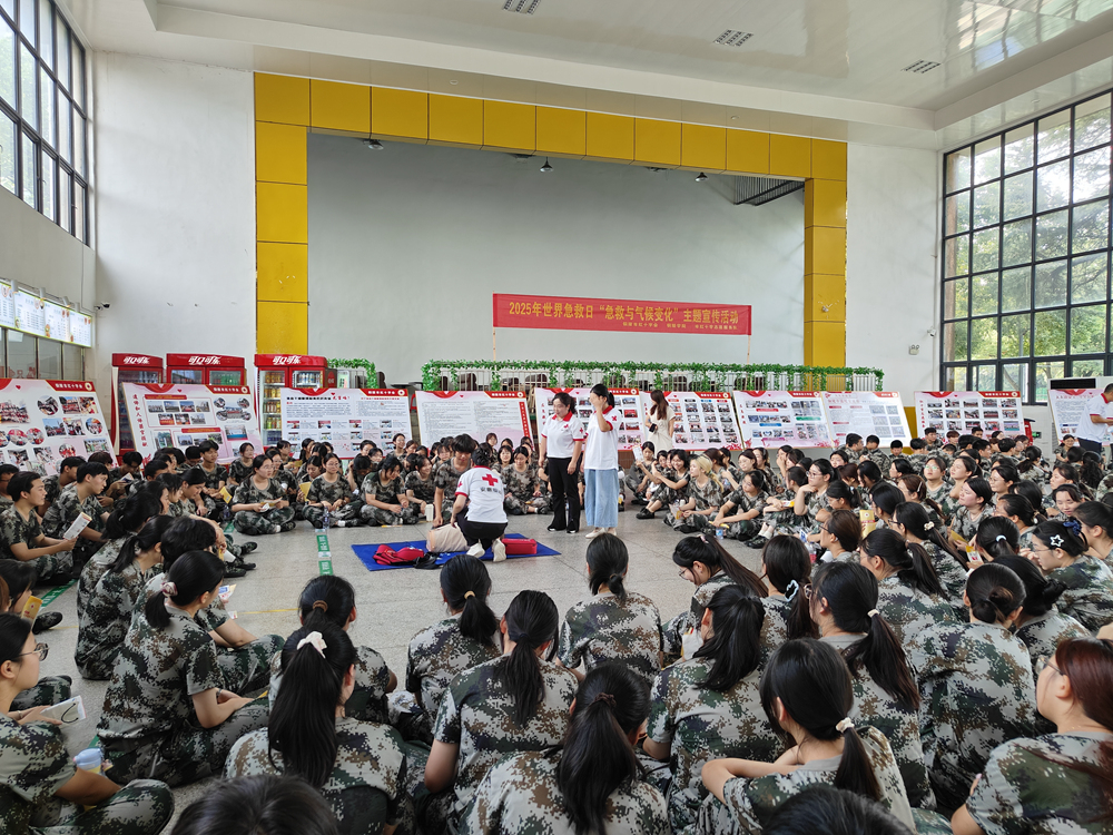 9月12日上午,市红十字会走进铜陵学院育秀校区开展世界急救日“急救与气候变化”主题宣传活动,为军训的800名大一新生开展了一场生动的普及性救护培训。